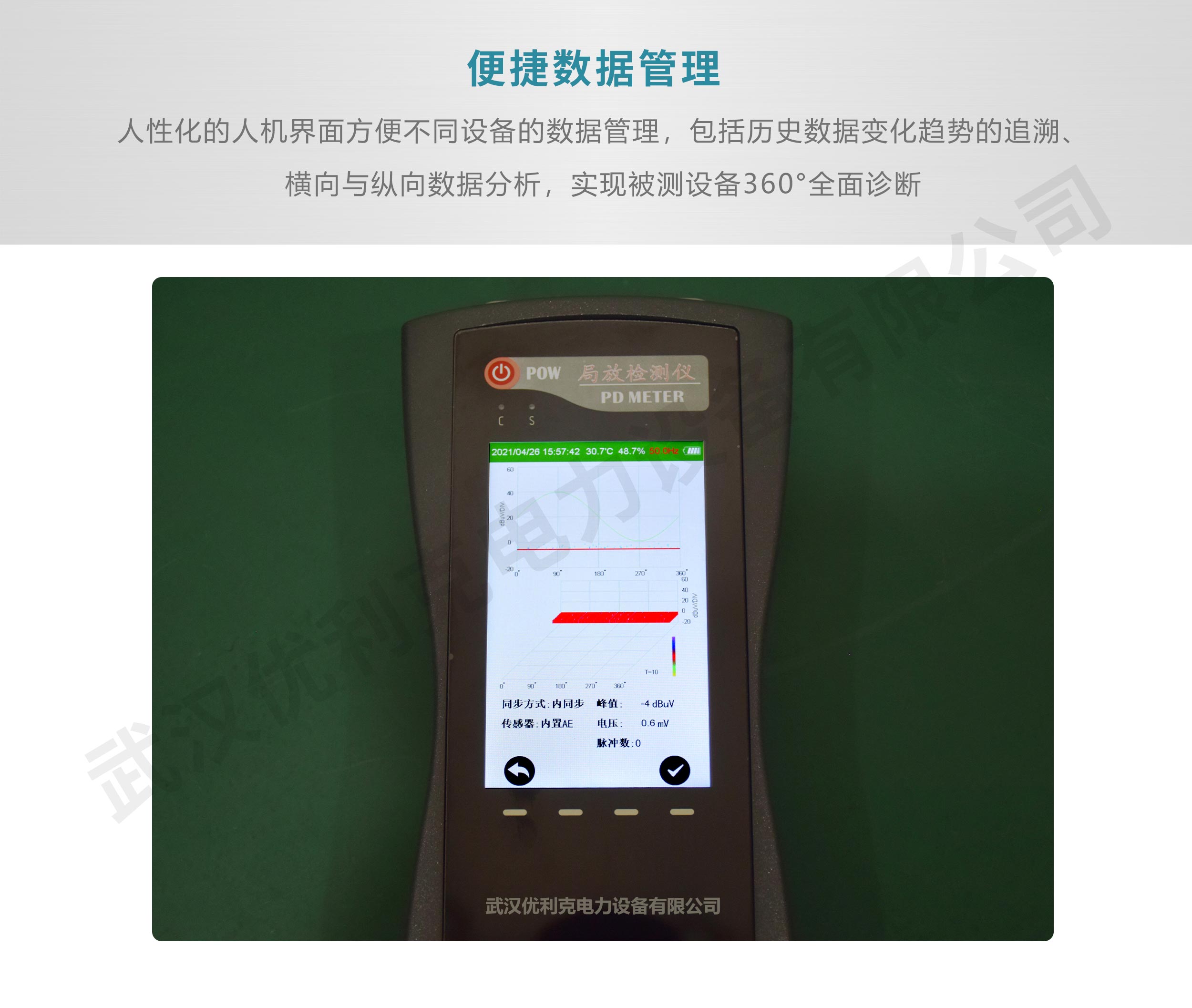 可以提供二維、三維圖譜的存儲(chǔ)以及讀出功能等,彩屏LCD顯示,不同顏色燈指示檢測結(jié)果,可以方便、快速評(píng)估電氣設(shè)備局部放電情況。